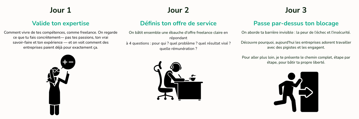 Moi, je te donne une méthode pour transformer CE QUE TU SAIS DÉJÀ FAIRE en une offre payante — peu importe ton domaine. Et surtout : tu as accès à moi en direct chaque semaine pour débloquer tes situations, pas juste des vidéos à regarder seul·e.